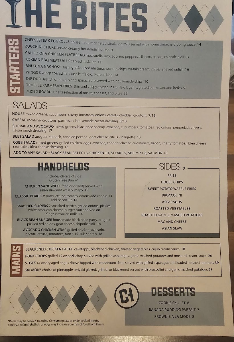 mixed greens, grilled chicken, eggs, avocado, cheddar cheese, cucumbers, bacon, cherry tomatoes.